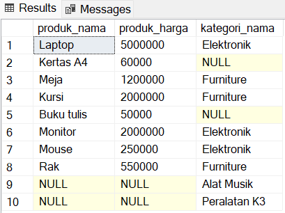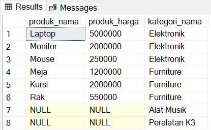 FULL OUTER JOIN digunakan ketika menggabungkan dua tabel dengan mengambil semua baris dari kedua tabel baik yang memiliki kunci yang sama maupun tidak. Baris yang tidak memiliki kunci yang sama akan diisi dengan nilai null.